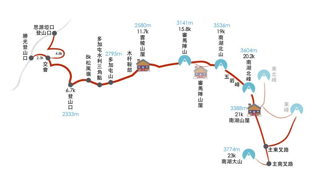 海拔爬升: 2614→3141→3536→3592→3500公尺 (上升900公尺,登上南湖北山稜線後,五岩峰上上下下,在南湖北峰下降100公尺)